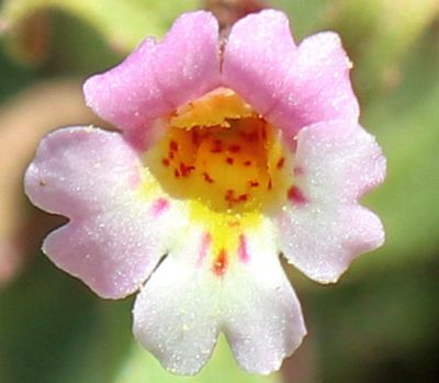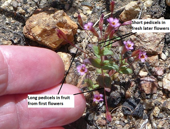 pedicels 15-27 mm long, 3 to 5 times length of bracts, permanently ascending ... M. androsaceusHowever, we have plenty of plants of M. androsaceus (as determined from the corolla markings) with pedicels shorter than the length of the bracts, which would be incorrectly determined using this key. One difficulty here may be that the pedicel elongates in fruit, and/or the pedicel has different lengths between the first flowers and last flowers; see Fig. 4.