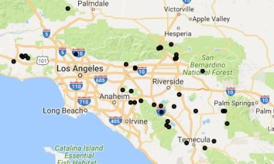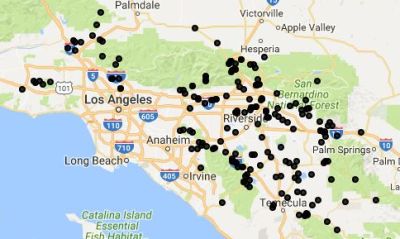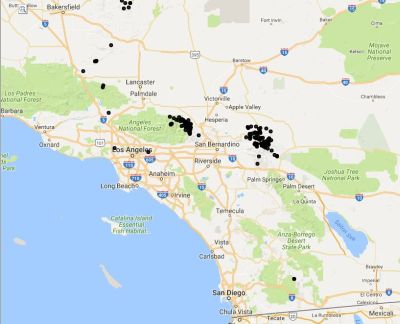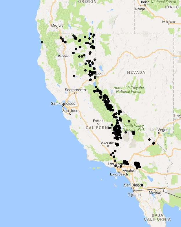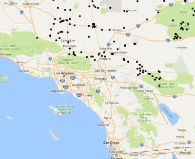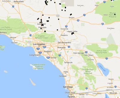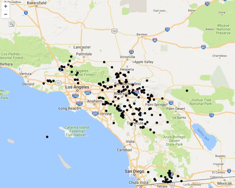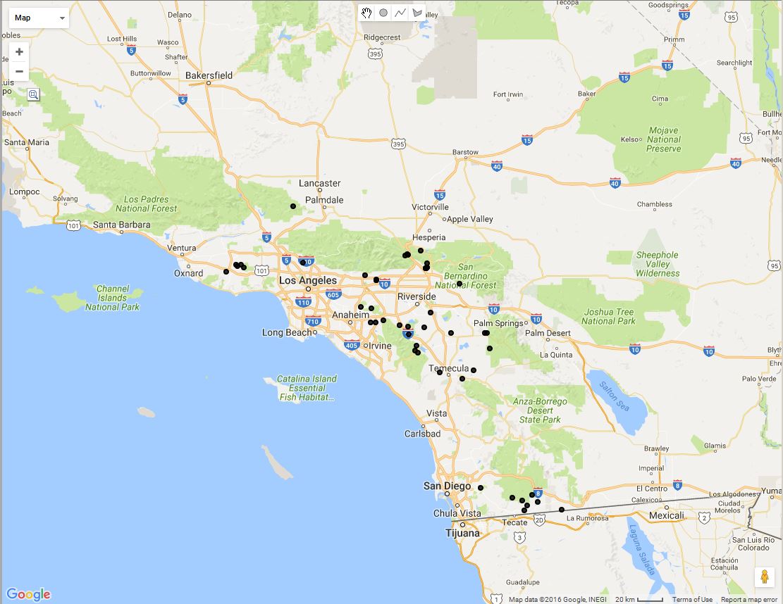 Fig. 6. A map of vouchers of T. comosa taken before 1980, showing areas where there have been no or few vouchers collected after 1986, possibly because T. comosa has been extirpated in those areas by urban development. This map does not show the population found in southeast San Diego County.Voucher data provided by the participants of the Consortium of California Herbaria (ucjeps.berkeley.edu/consortium/).