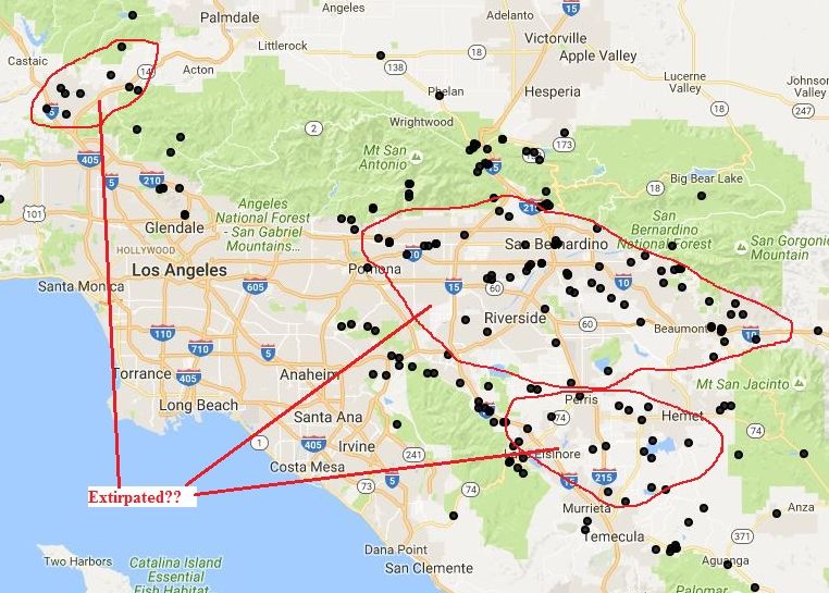 Because the area of the main population of this species is now occupied by dense human development, this species is now mostly restricted to the edges of its former distribution, in what might not be ideal habitat for this species. This may be yet another of the species formerly common that have been made rare by human encroachment on its habitat. Worse, it is possible that the edge populations depend on replenishment from the main population, which is no longer possible. Surveys are needed to establish what the current numbers are for this species. See Comparison of post-1986 Voucher Collections to pre-1980 Voucher Collections for what may have happened to this species.