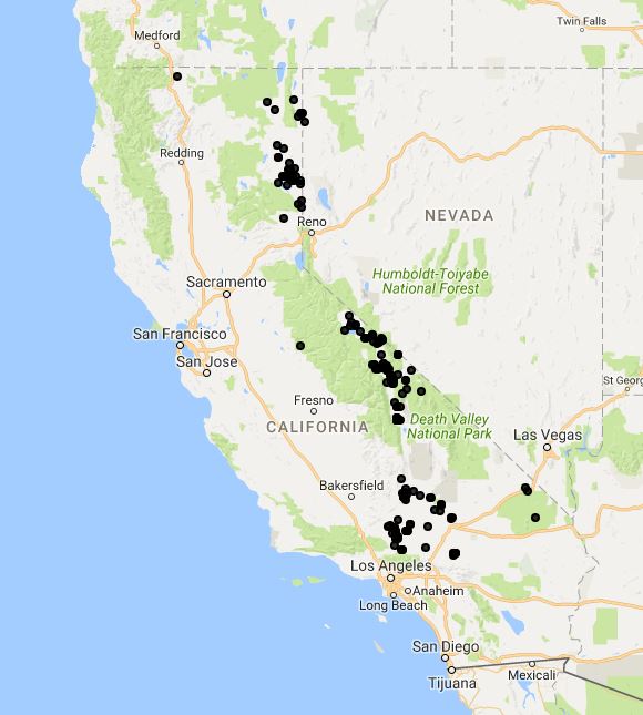Fig. 3. The geographic locations of vouchers of T. comosa for the San Jacinto Mountain area. The rectangle shows the area displayed in Fig. 4.Fig. 4 shows a Google Earth view of the locations of the 159 plants found by Bruce. See Fig. 3 for the location of the area displayed in Fig. 4 on a map.