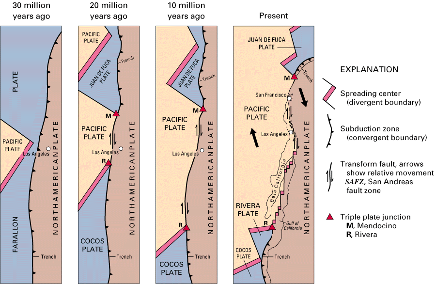 Figure 9. Schematic representation of the arrival of the Pacific Plate led by the spreading center of the East Pacific Rise. Transverse motion is initiated in the San Andreas Fault Zone. Spreading produces the Gulf of California and fault block basins of eastern California.