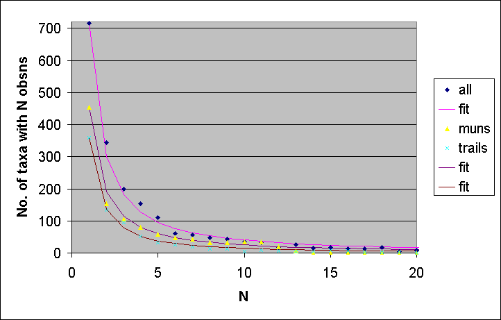 - After you continue to double the area enough times, there will be very few species that are found in each area A. Most species will be found in only a few of the areas of size A!
