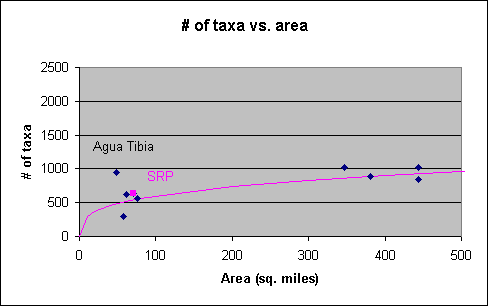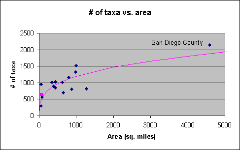 - It makes sense! More area allows more species to exist. The number of species cannot increase as fast as the area, since some species will be found in the larger area.