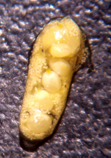 The picture at left shows the transparent tissue (on the right of the yellow spore cases) that connects the spore cases. The spore cases are on top of a dandelion digger whose tip is 16 mm wide at its widest part. Inside the third spore case from the top, the seed-like megagametophytes (~0.8 mm long) are visible, which will develop into clover ferns. A better view of them is seen on the right picture, taken on top of a manila envelope.