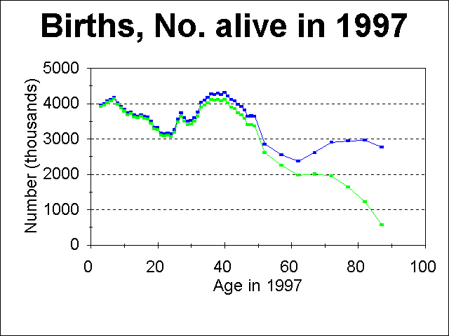 The data were given in 5 year age brackets, except for the population over age 75. To normalize the population in that age bracket, I assumed an effective upper age limit of 95.