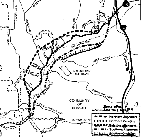 About January, 1999, a group of Caltrans and SANDAG representatives, including design engineers and Caltrans environmental representatives, participated in a 3 month study to develop alternative routes. They considered about 10 routes, including a route through Gopher Canyon, but wanted to narrow it down to a few routes to minimize the immediate impact on the Fallbrook / Bonsall community.
