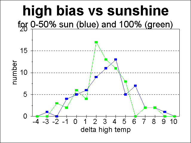My "high temperature thermometer" is located underneath my porte cochere, and the concrete underneath it traps solar heat and may keep the temperature there a bit warmer. However, the following plot shows that there is no noticeable effect versus the amount of sunshine, which leads me to question whether there is any significant bias due to this cause. Thus this bias may simply be due to a bias in my thermometer, or a real difference in temperature between my location in the Winterwarm area compared to the location of the official Fallbrook temperature near downtown.