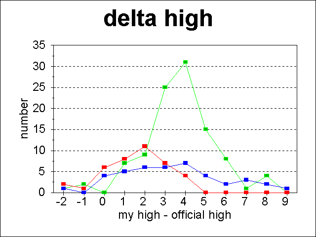 The following plots show histograms of the temperature differences between my temperatures and the official temperatures for various ranges of official temperatures: