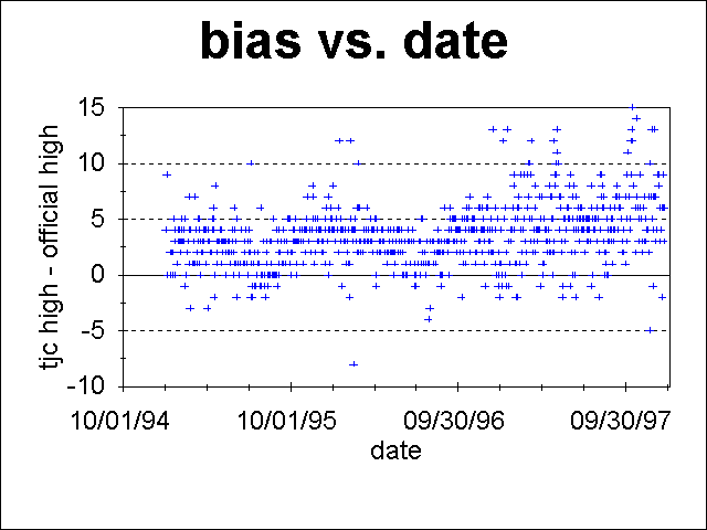 The plots below use data from 1995 through 1997 to explore the high temperature bias further. The leftmost plot below shows that the high temperature bias is only weakly correlated with date. The rightmost plot shows the bias has the same correlation with temperature as found in 1997.