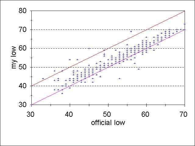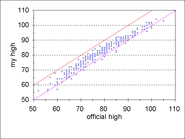 Two lines are shown for comparison: one that represents identical temperatures, and one where my temperatures are 10o hotter than the official temperatures. (10o is an interesting comparison since it could result from a typo in the tens digit.)