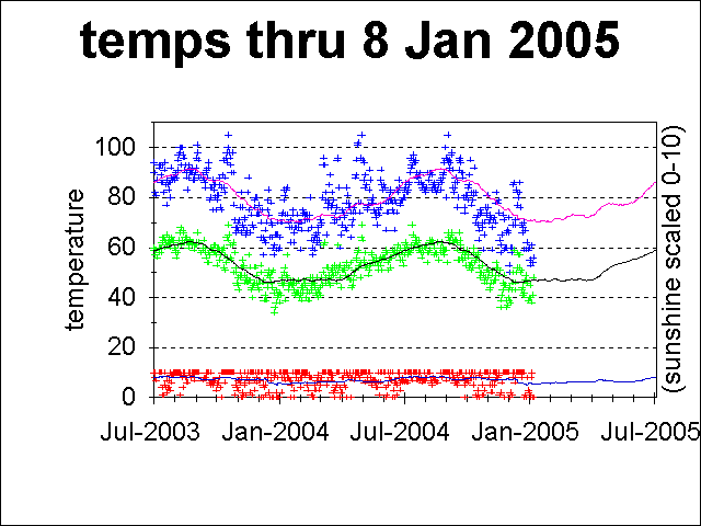 - The low temperature (green crosses) recorded several feet away from my house, which is probably biased high by 2°.
